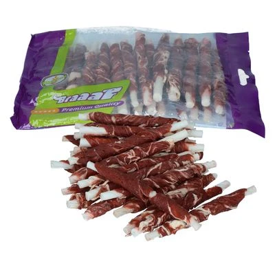 Braaaf palitos enrollados de vacuno con bacalao hechos de sabrosa carne de vacuno combinada con bacalao y sin gluten ni cereales. Además, favorecen el cuidado dental.