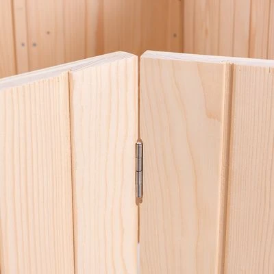 La caseta tiene un revestimiento protector inocuo, también la puedes instalar en el exterior, en zona protegida de las inclemencias y aplicando anteriormente un producto protector de madera. Además, como se puede plegar fácilmente la podrás colocar dentro cuando lo necesites, solo tienes que desdoblar las paredes, el suelo y el techo para colocarla en el lugar que desees.