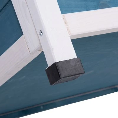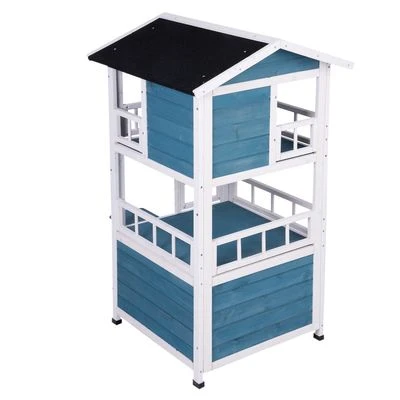 Con esta casita en tonos azules y blancos tu mascota disfrutará de un gran espacio donde relajarse. La casita, ideal para cachorros y gatos pequeños, dispone de tres pisos. La planta baja es perfecta para dormir o esconderse. En la segunda planta, la cual dispone de una barandilla, tu mascota podrá relajarse y estirarse en la zona chill out.