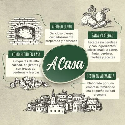 Lukullus A Casa está disponible en diferentes y sabrosas variedades. Está compuesto por sabrosa carne y pescado, a los que se le añaden superalimentos como la remolacha, la grosella y las bayas de aronia. Los aceites de nuez, de salmón y de borraja aportan omega 3 y omega 6. Las croquetas, que no incluyen cereales se hornean lentamente para que se mantengan tanto los nutrientes como el irresistible sabor. Las diferentes recetas naturales proporcionan los nutrientes necesarios para que tu perro se mantenga sano.