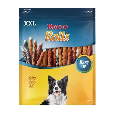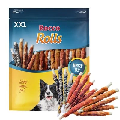 Una mezcla de los 3 sabores de Rocco Rolls: 2 x 250 g Rocco Rolls con pechuga de pollo, 1 x 250 g Rocco Rolls con pechuga de pato, 1 x 250 g con piel de pescado
